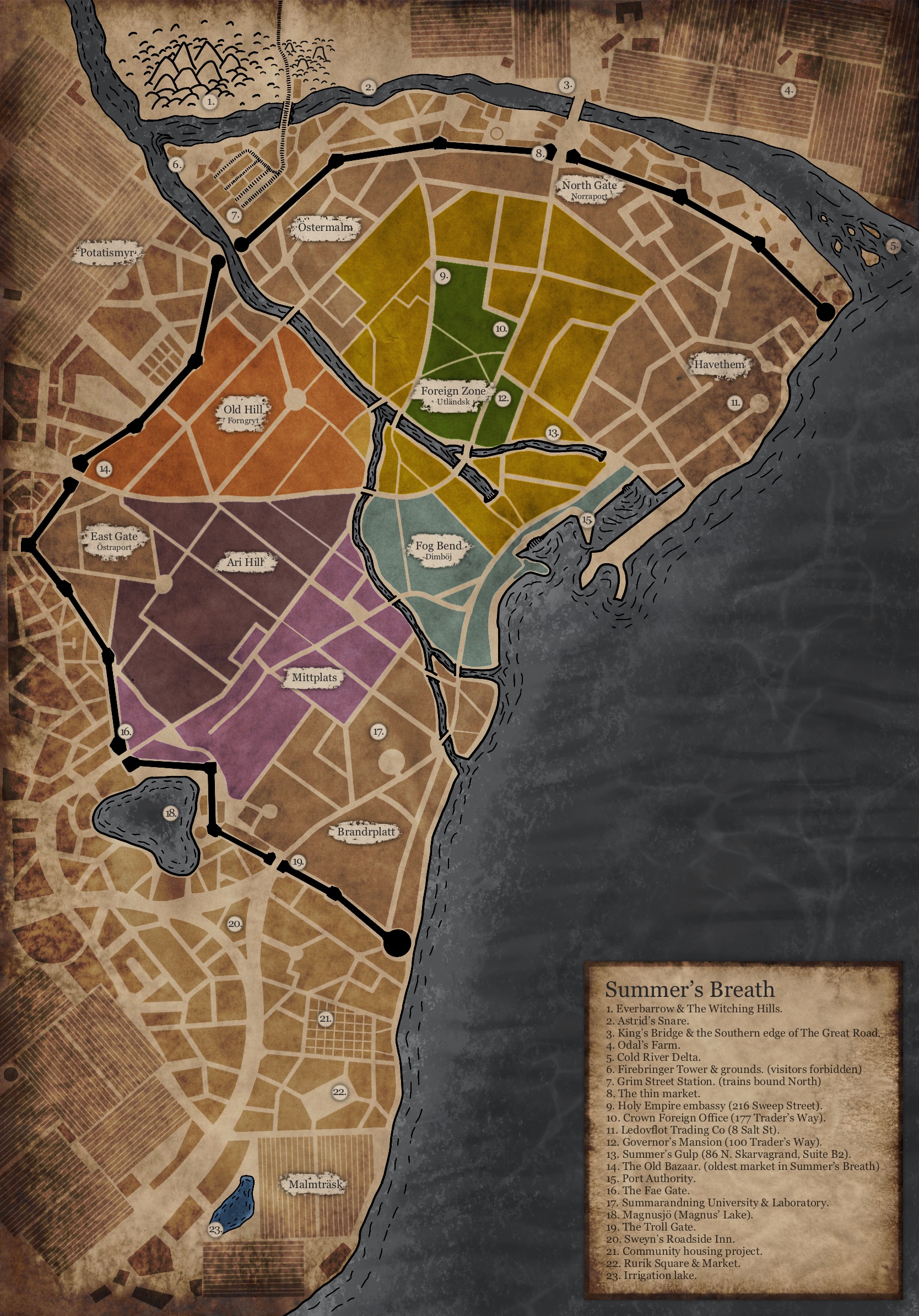 Known in the native tongue as Sommarandning, Summer’s Breath is one of the largest cities in The North and the main seat of the Tribunal of the 5 Kings. It sits along the Eastern edge of peninsula along the waters of the Baltic Sea.